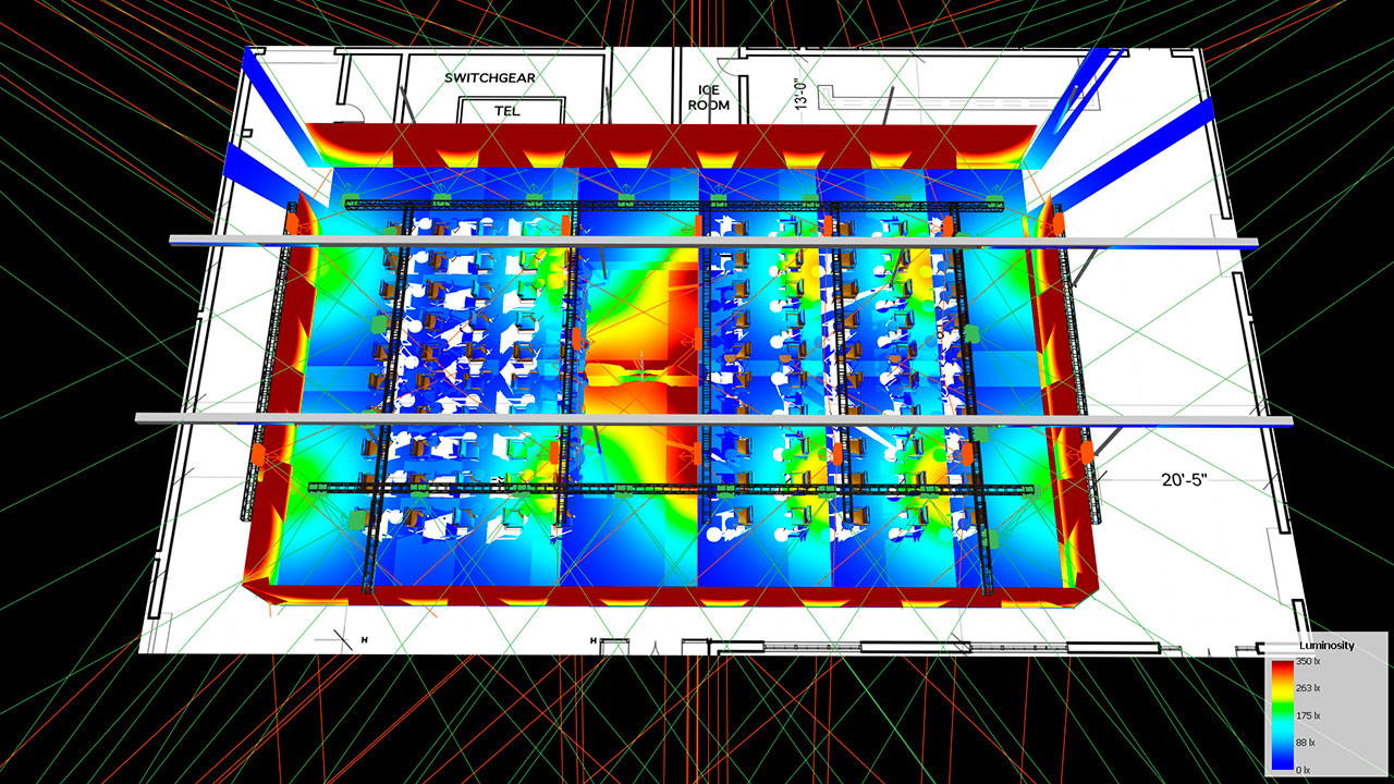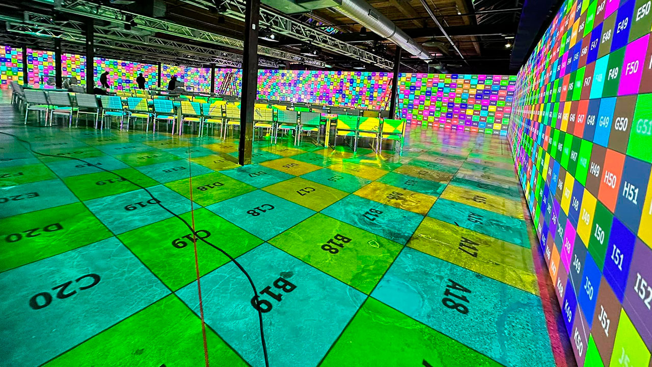 Given the low-ceiling, A3 Visual used some Epson projectors with the snorkel lens. A total of 40 projectors were needed, with a mix of 13K projectors for the floor, and 6K projectors for the walls. “Modulo Kinetic helped us a lot on this one because we needed to cover more surface area on the floor and make sure the luminosity was bright enough to match the walls” adds Sean Mason. “As we were working with different projectors, we used the projection study tools in Modulo Kinetic to handle that.”