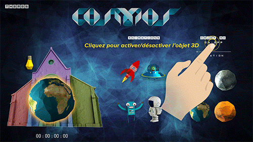 This is the first time Pixel n’Pepper had the chance of creating an interactive installation for children and parents. They chose the Origami theme to create small 3D paper scenes. Using a touch screen of 42 inches, the user was able to choose between 4 different themes in which he could select different animations and apply them to the facade of the Chapel Ste Foy, which was divided into 5 zones. The players could also play with 3D objects such as a planet, a giant squid or a lion, and make them move in real-time, or change their textures and colors.