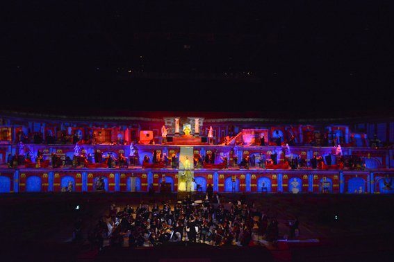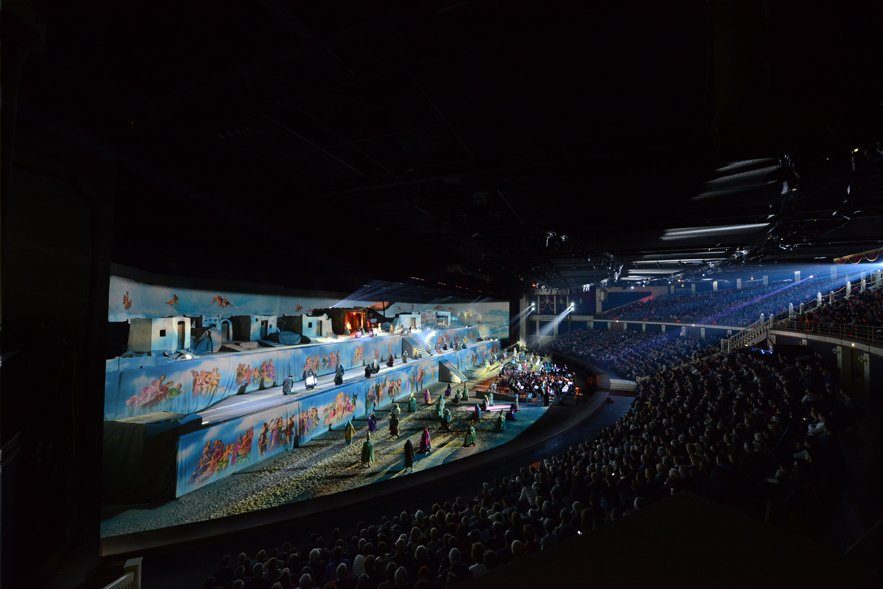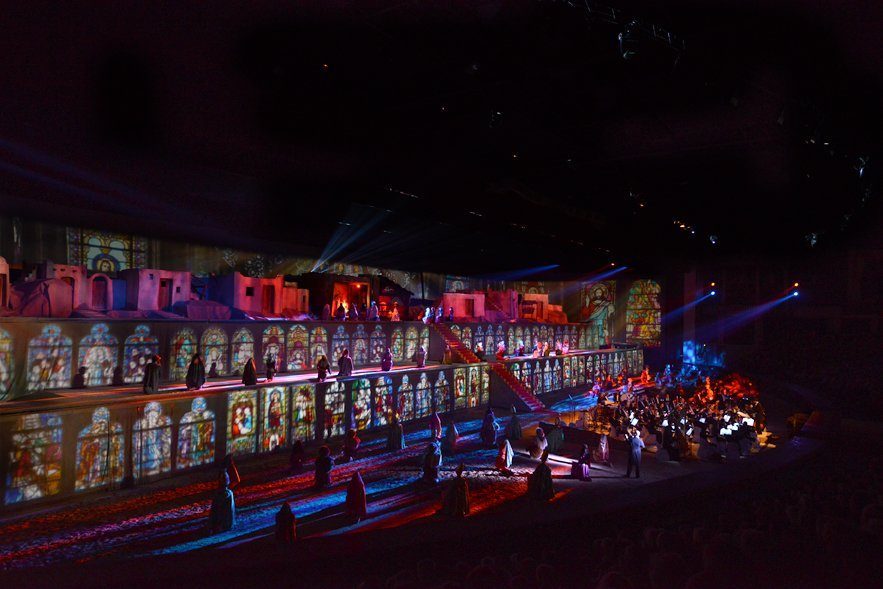 2013, Puy du Fou< "The Christmas Mystery" is a show which combine music, light show and acting. The Prague Symphonic Ensemble is performing the music in live. The show required 12 projectors.