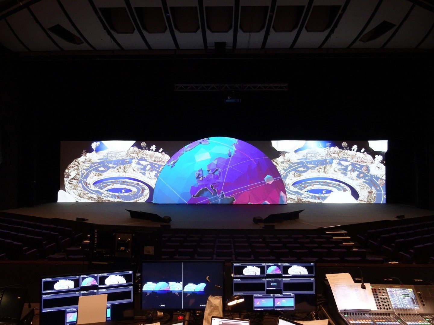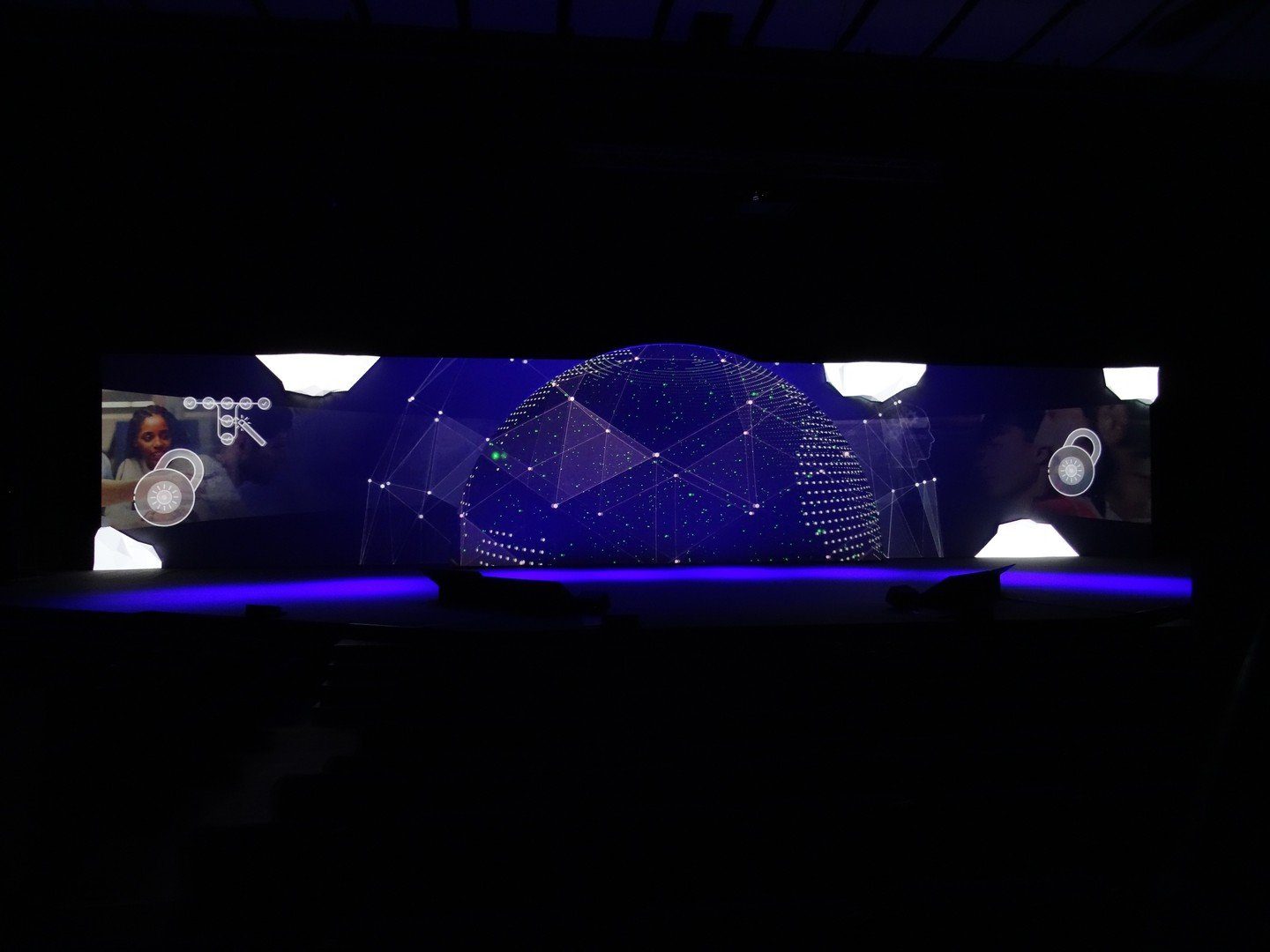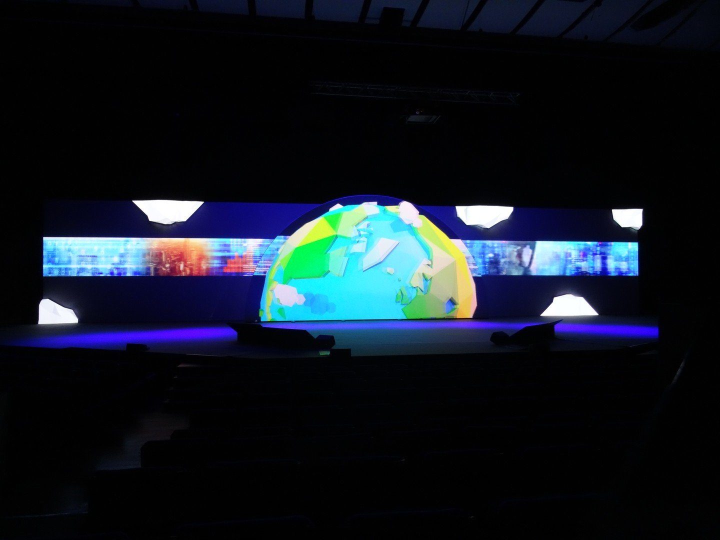 The main stage used for keynotes consisted in two wide screens, plus a third screen with a globe