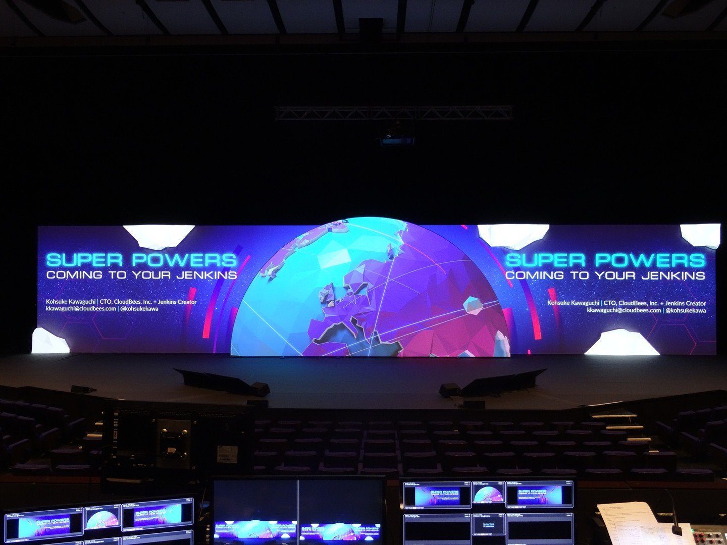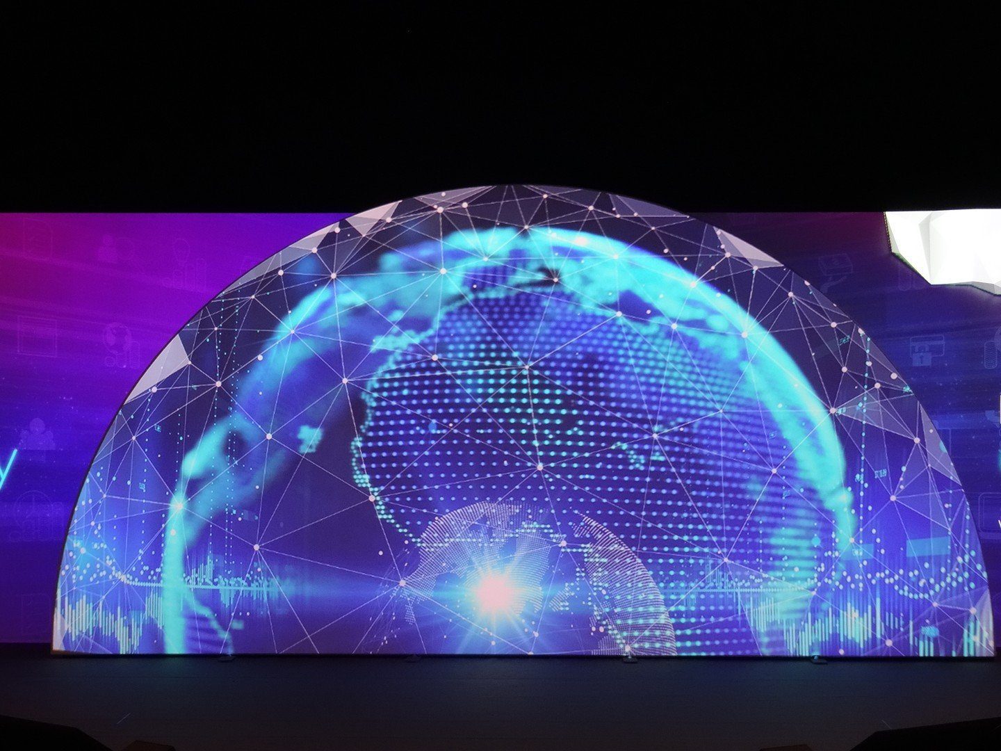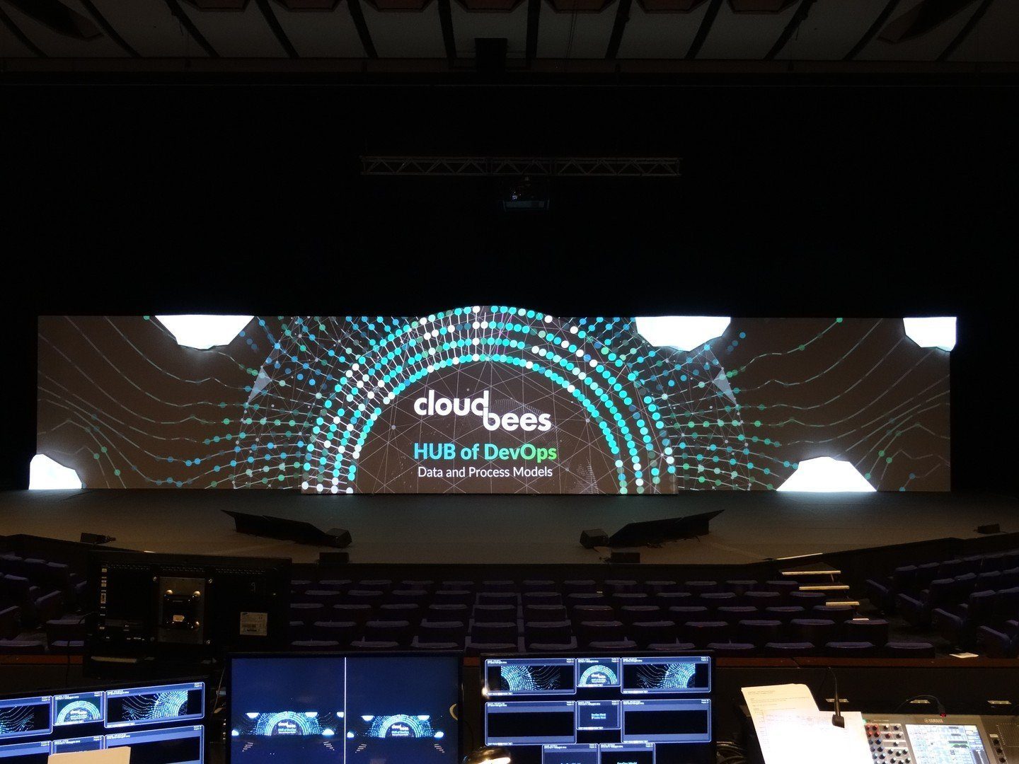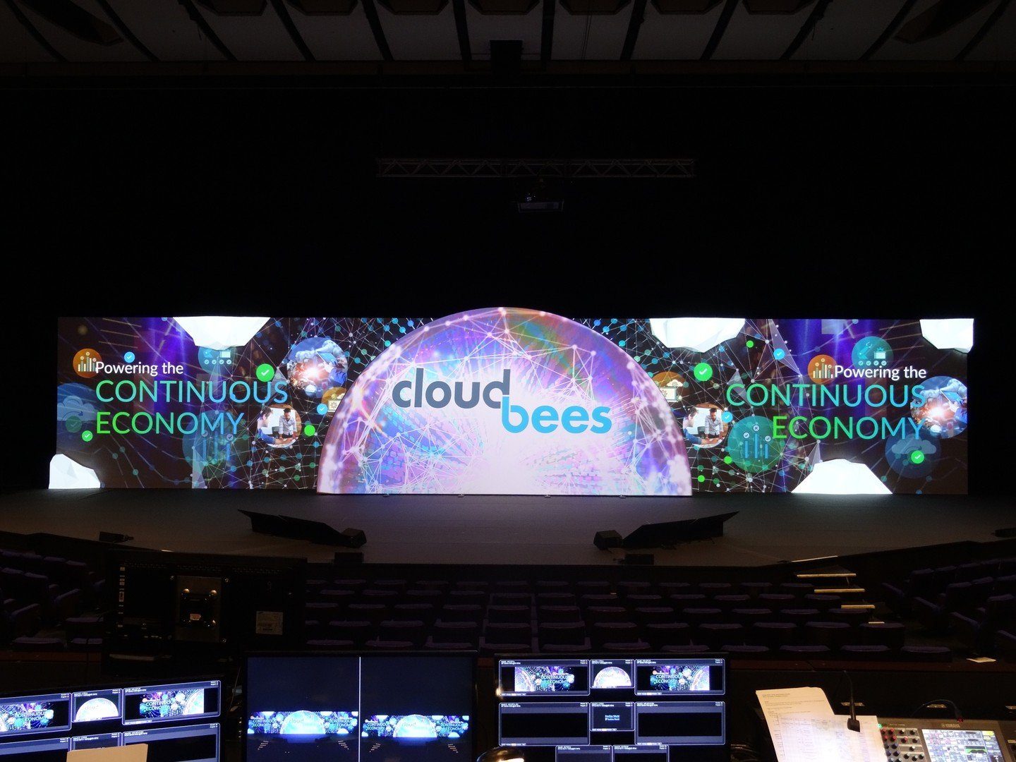The main stage used for keynotes consisted in two wide screens, plus a third screen with a globe