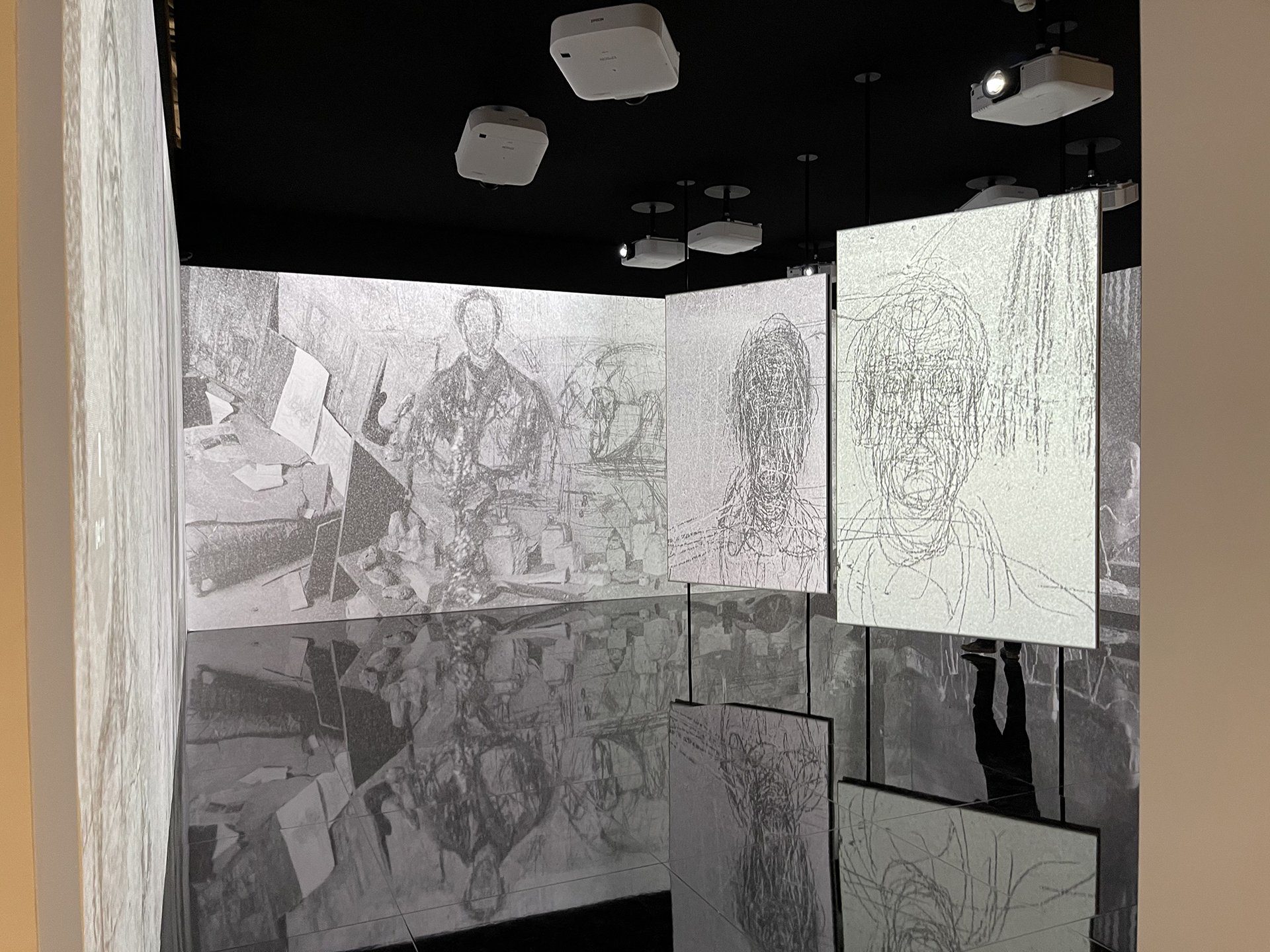 High point of the exhibition, an immersive space was designed by the Grimaldi Forum in close collaboration with the Fondation Giacometti. Created out of the foundation’s archives, the room offers an immersion in the artist’s famous Parisian studio. Within the installation, the studio is represented on the floor, while the walls reveal an animated fresco showing a reconstructed vision of the studio through video projection.
