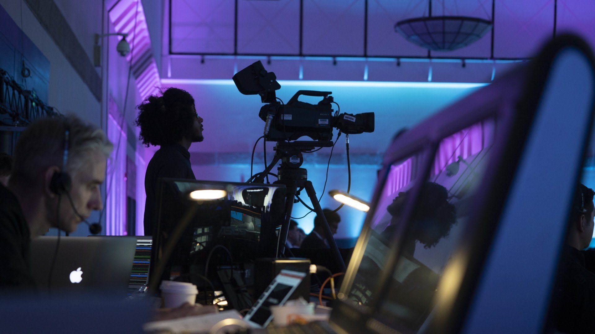 All AV elements including projection, sound, lighting, cameras, record decks, live streaming, content creation (i.e. motion graphics and projection video elements)