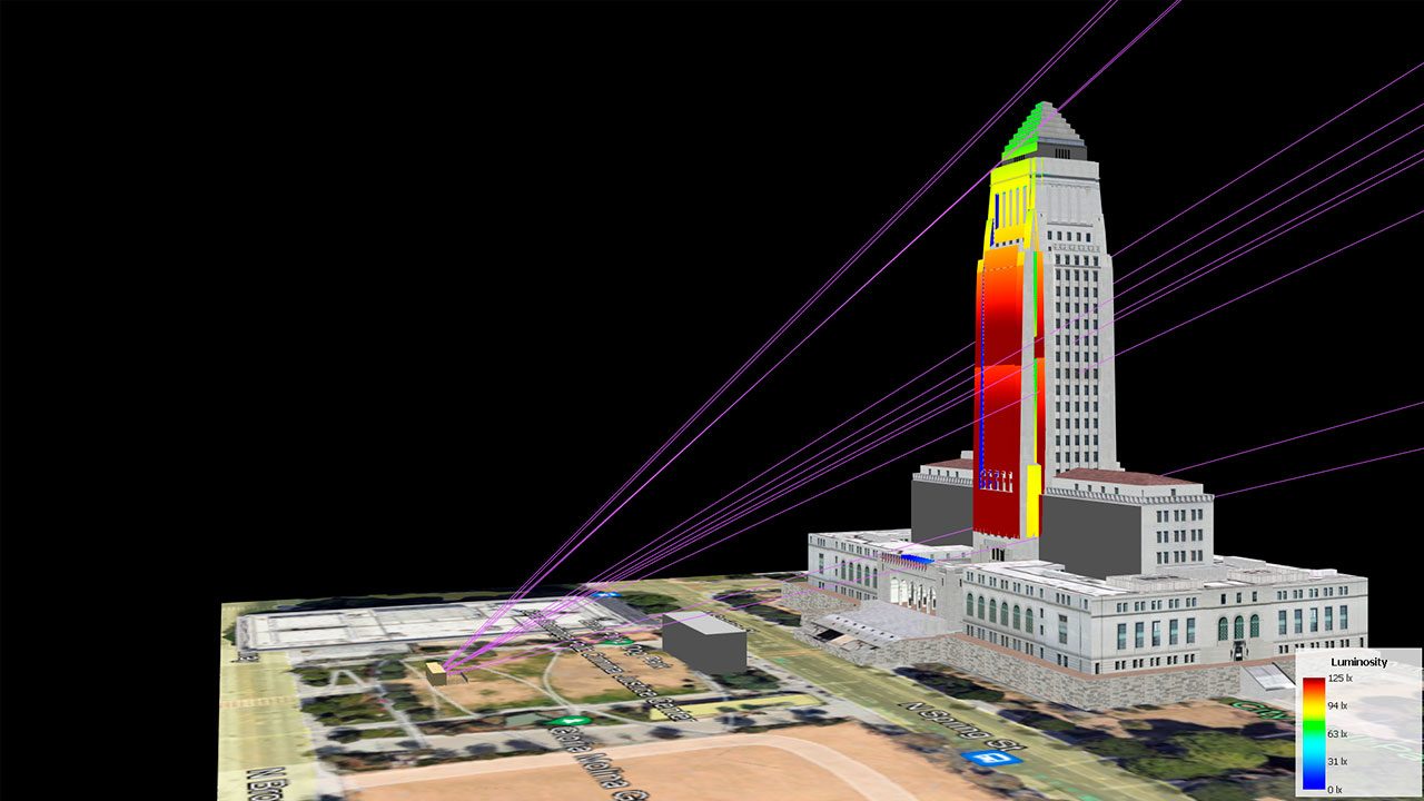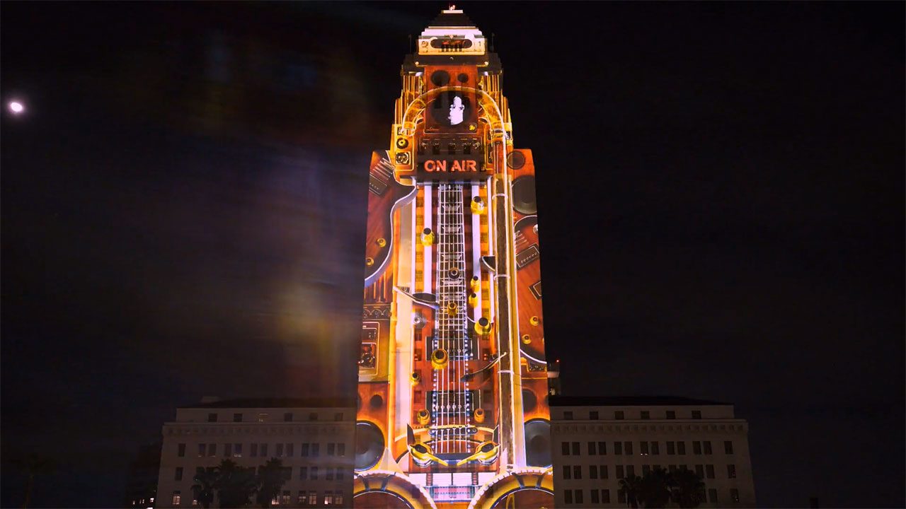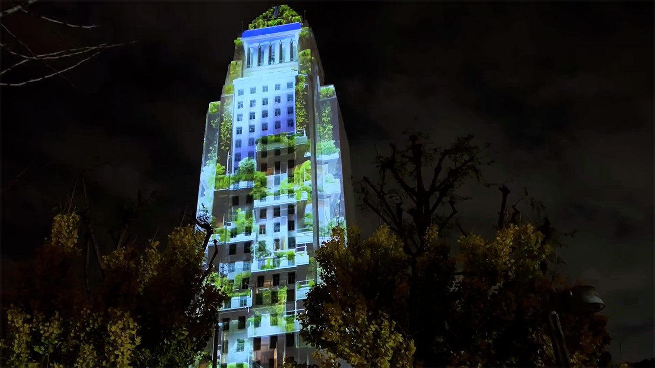 In the early evening, Modulo Kinetic played the content produced by a VJ on Resolume thanks to a low-latency live input embedded in Modulo Pi’s media server. The 5-minute countdown created by Spectre Lab and projected on Los Angeles’ City Hall was then played by the media server.