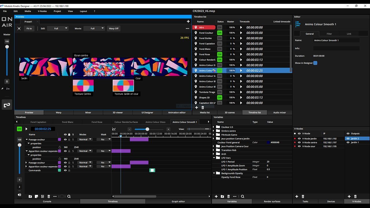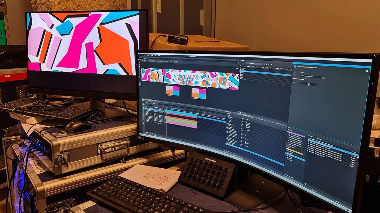 The LED walls were powered by Modulo Pi‘s Modulo Kinetic server media: 1 x Kinetic Designer workstation drove 3 x Kinetic V-Node servers equipped with 2 x 4K outputs per server. Using Novastar controllers, each V-Node was associated with a LED wall, with an output resolution of 5568×1728 pixels for the central screen, and 4864×1664 pixels for the side screens.