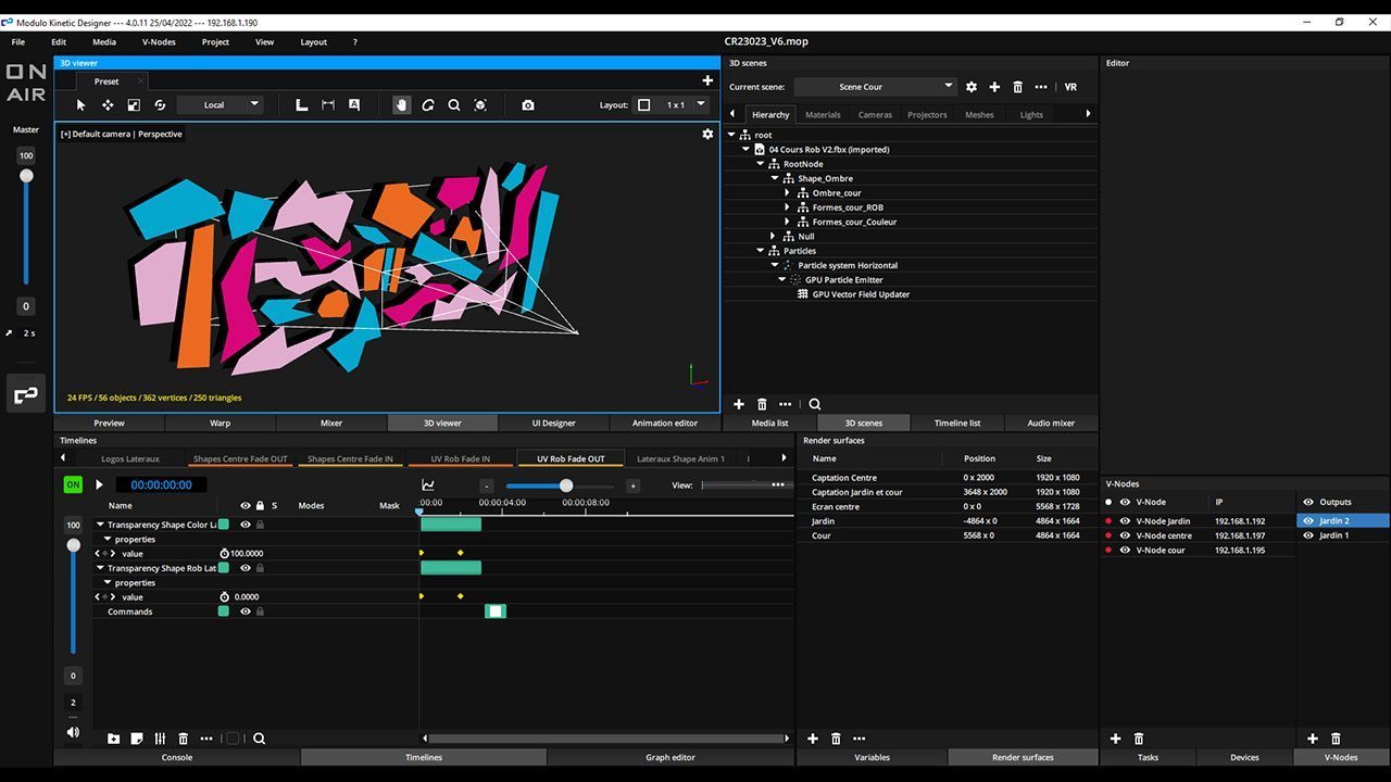 The V-Node servers associated with the side screens were equipped with an output card. Using Modulo Kinetic‘s nodal programming editor, the 3D objects and animations imported into the servers were mixed with the live capture of the fireworks and VJing. The video feeds were UV mapped into the 3D elements previously imported into Modulo Kinetic. The media server was thus able to mix and play 3D and live content during the event.