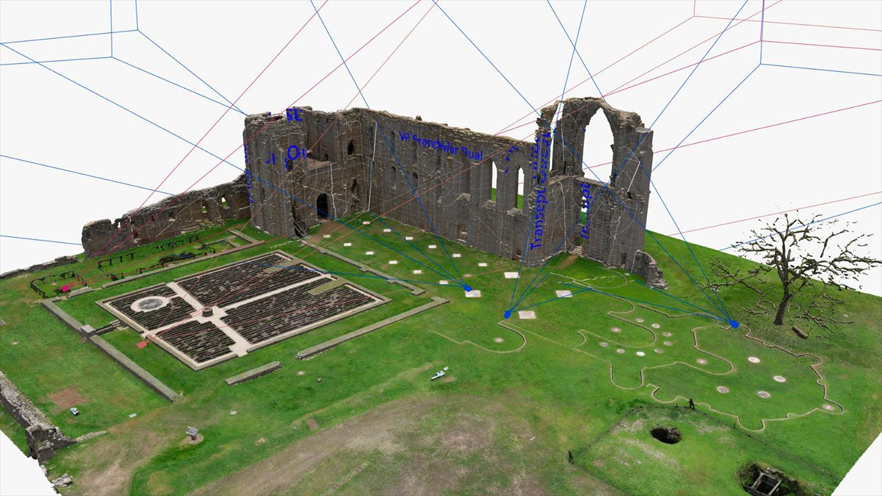 Using a drone, a photogrammetry was performed, allowing to extract a 3D model of the old abbey. The 3D model was then imported into the Modulo Kinetic Designer workstation to simulate the show beforehand, and then calibrate the projectors using 2D-3D connection points while on-site.