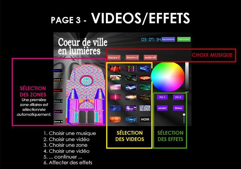 Yan Kaïmakis and ID Scènes imagined a participatory and interactive mapping concept: spectators used a touchscreen to control live projections. Sounds, fixed images and video effects allowed more than 6 000 000 combinations. For the first time on Saint-Pierre cathedral façade, the innovative show presented during « Coeur de ville en lumières » 2016 attracted more than 300 participants.