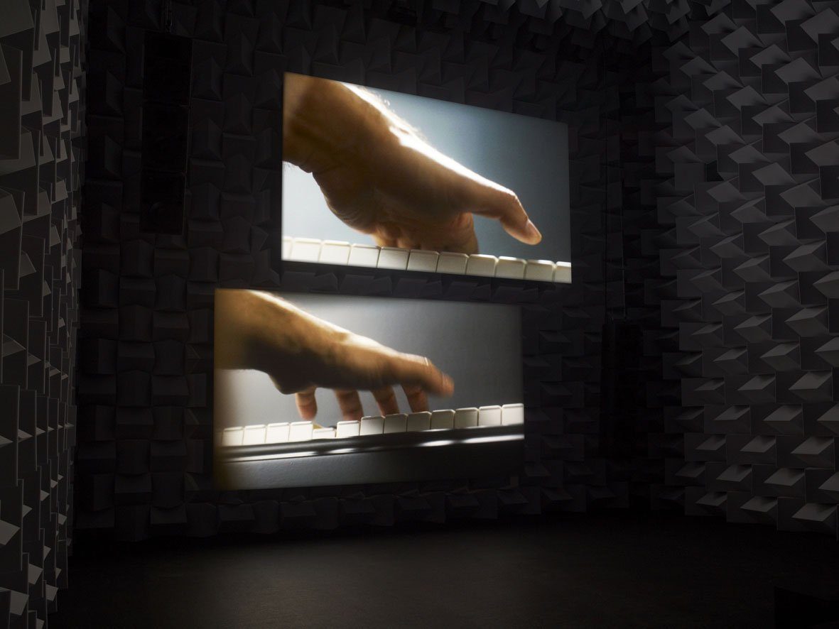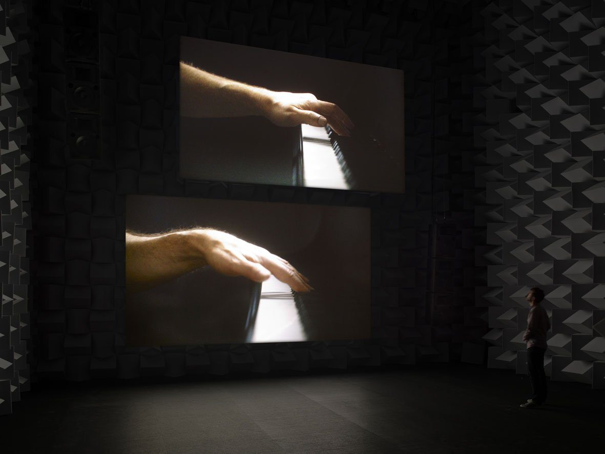 Ravel Ravel Unravel is an art exhibition set on the french pavilion during the 6 months 55th Venice Bienale exposition. The project is about two musicians performing the same music. Anri Sala explains that « each movie focuses on the left hand choregraphy dancing all over the keyboard when the right hand remains motionless »