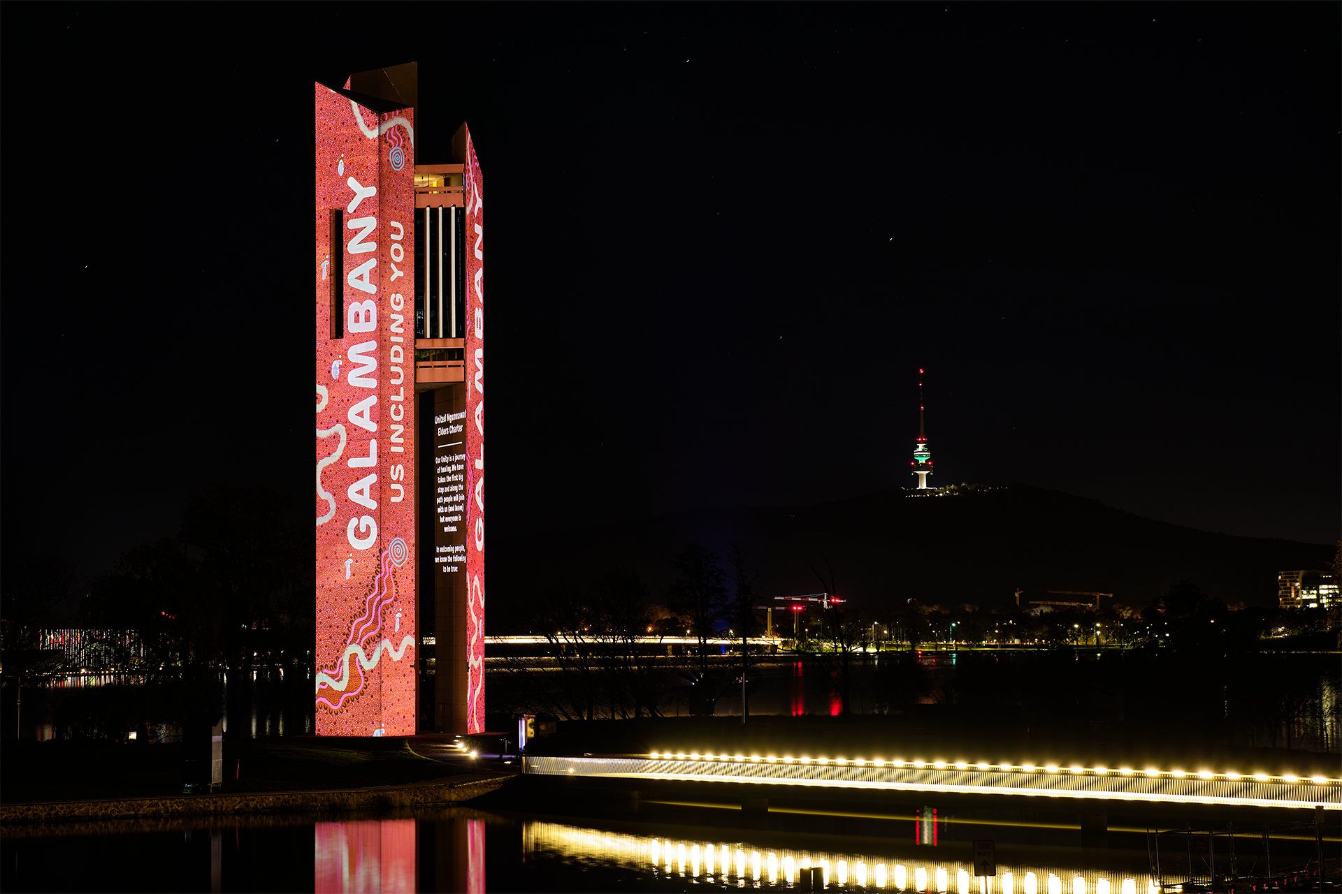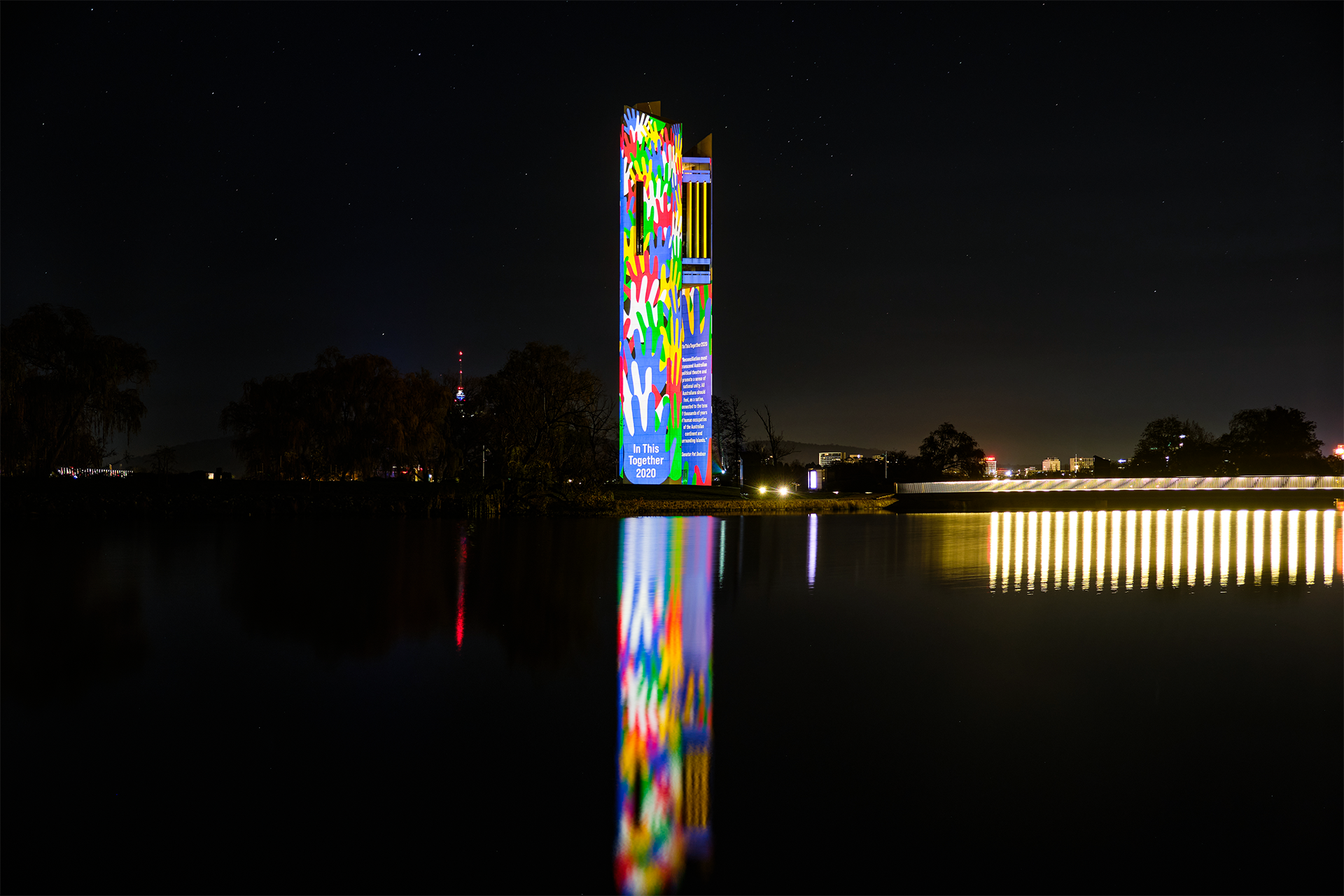 On the occasion, The Electric Canvas (TEC) was approached to project onto the Carillon in Canberra over the eight nights of Reconciliation Week, with each night dedicated to a different Indigenous organisation or in observation of key dates. Over little more than two weeks, TEC’s creative department engaged with eight separate organisations, as well as Indigenous artists, in order to develop their pieces for projection.