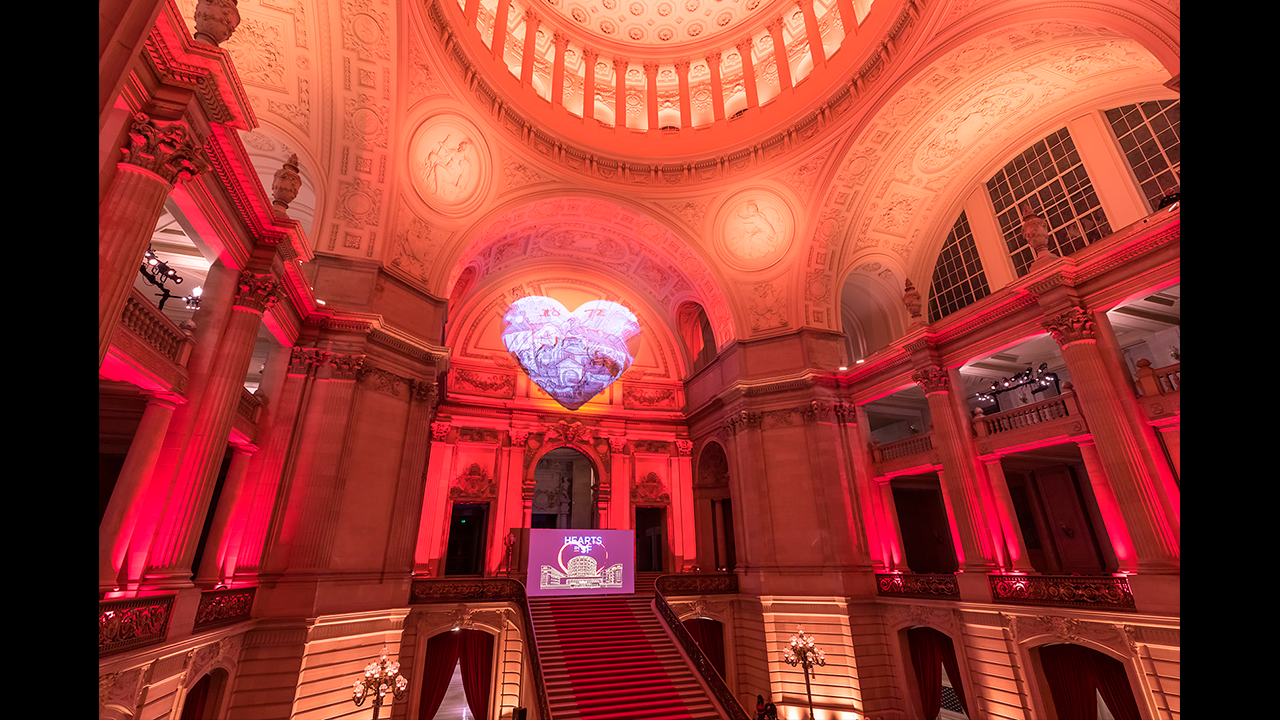 In partnership with Peridot Productions, teams of A3 Visual created a welcoming and sophisticated atmosphere using lighting and video mapping. The iconic rotunda of the city hall was mapped using 1 x 30K Panasonic projector, allowing to showcase eye-catching animations and engage guests in an immersive, audio-visual experience. The centerpiece of the projection was a digital heart featuring the artwork of local artists.