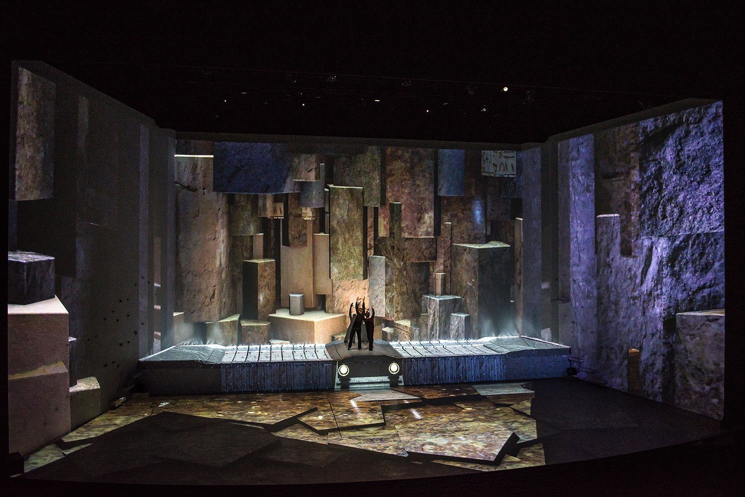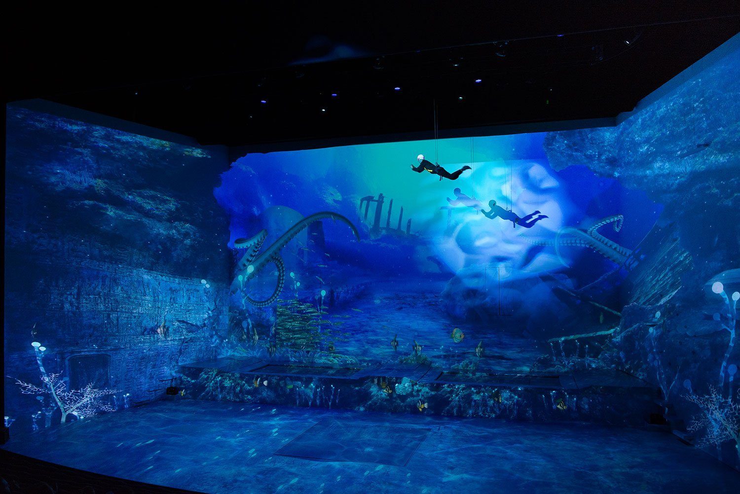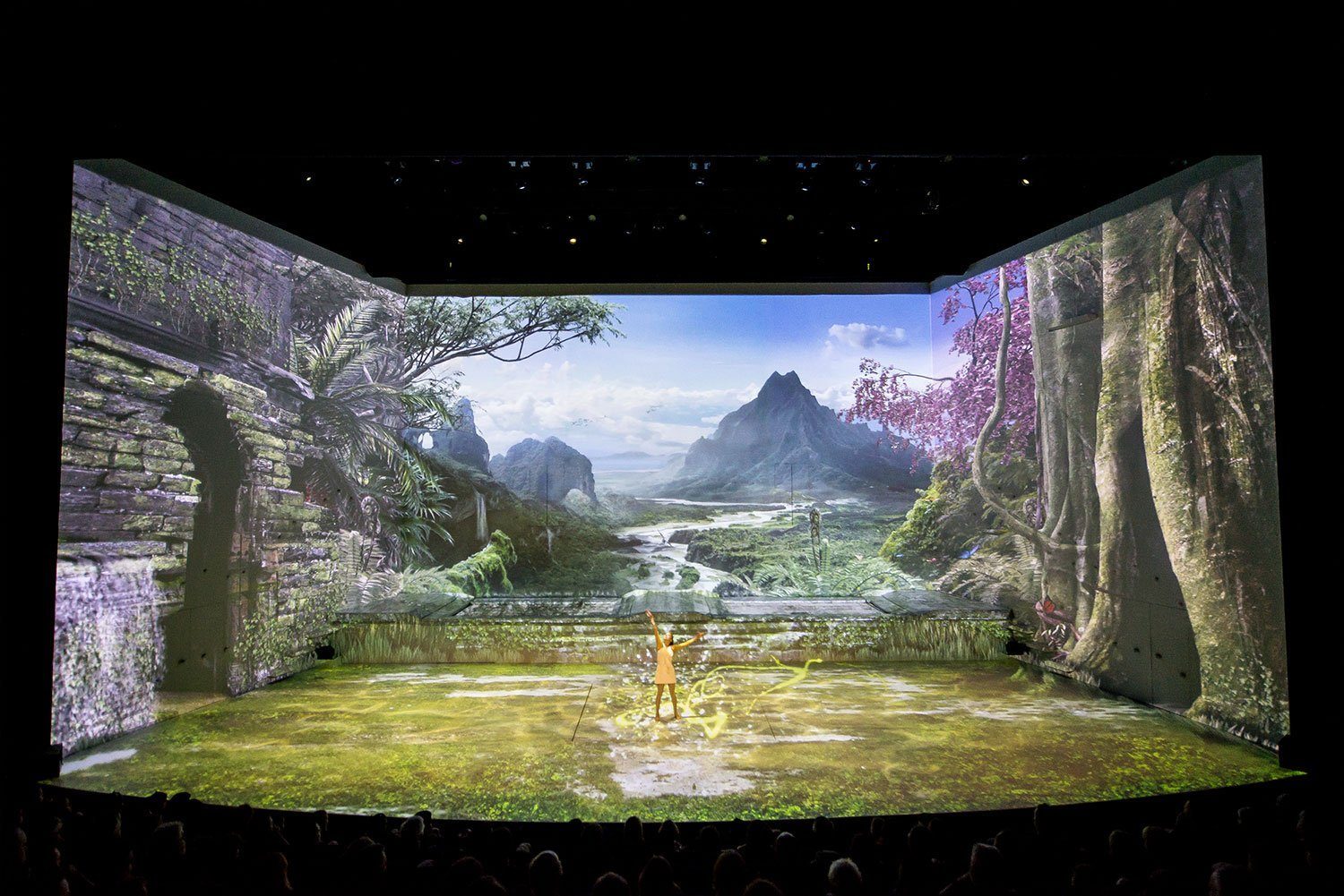 600 m2 video mapping as decors for an unique show with acrobats and dancers.