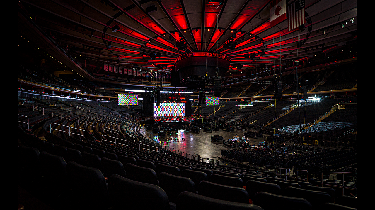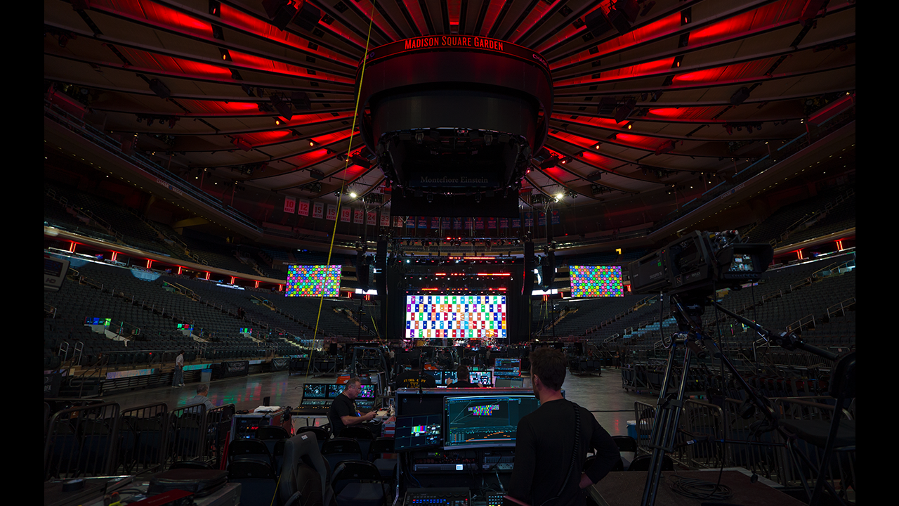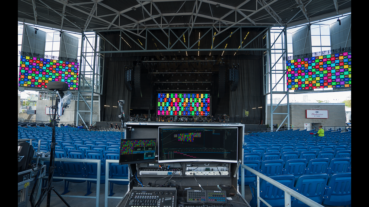 In terms of content, the screens display both graphic visuals and live camera feeds. Depending on the songs performed, different visual effects are applied live via Modulo Kinetic – such as 1970s-style TV effects, black & white, blue LUT, or red/green city light looks.